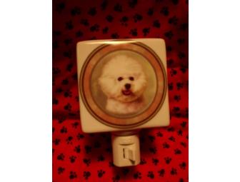 WOULDN'T YOU JUST LOVE TO HAVE THIS PRETTY LITTLE BICHON NIGHT LIGHT TO SHOW YOU THE WAY IF YOU NEED TO GET UP DURING THE NIGHT? SUCH A SWEET PICTURE OF THIS PRETTY LITTLE BICHON SURROUNDED IN A GREEN/BROWN SHADED CIRCLE.