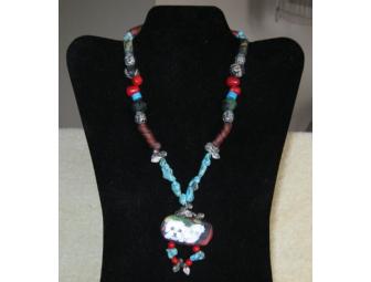 This necklace is made of various styles of beads and also turquoise nuggets.