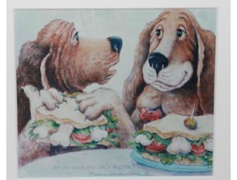 This adorable 8"x10" print features 2 Basset buddies enjoying a lunchtime snack of Milk Bone sandwiches. It is framed in a sleek black frame.