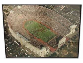 This aerial photograph of the Horseshoe was taken prior to the recent renovations. It features the OSU Marching Band performing the legendary Script Ohio on all four sides of the football field.  Approximately 35" x 26"