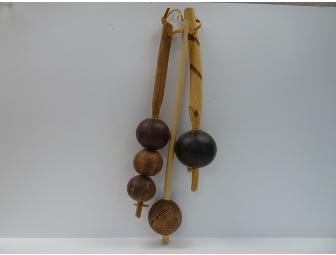 Set of three, distinctive handmade African maraca like instruments. Produced from natural materials. Each is unique in its crafting and gourd size to produce a different effect. 13"x 4"
