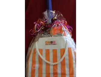 America Runs on Dunkin and now you can too! This adorable bag is filled with two pounds of coffee, a t-shirt, another tote bag, pens, two heavy-duty take out style keeper cups, an umbrella and more.