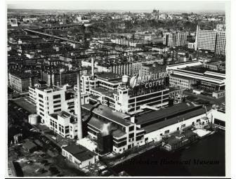 Black-and-white aerial photo of the Maxwell House Coffee plant, February 17, 1949. View is looking northwest with sign visible. At the right is Bethlehem Steel Hoboken Shipyard and a small portion of the Lipton Tea building is visible.