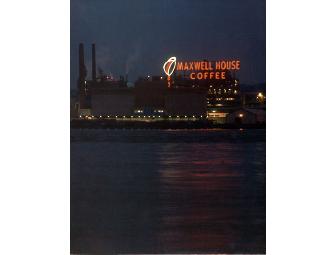 Color photo of Maxwell House Coffee plant & neon sign at night from Hudson River, Hoboken, circa 1960-1980.