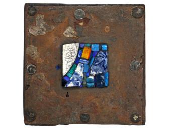 Tesserae: Found metal, nails, mixed material tesserae including glass, ceramic and Smalti on found wood backing