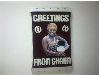 This beautiful cloth wall hanging was made from local materials in Ghana, It serves as a greetings message. It features a picture of a Ghanaian lady pouring water from a pot into a calabash which signifies hospitality and a sign of welcome to the home. It also has a Ghanaian symbol called "Gye Nyame" meaning "only God." 11" x 17"