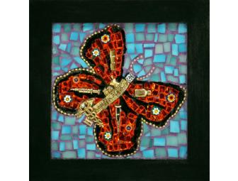 "I chose a butterfly to represent the doctors who fly all over the world to give of their services. The gold pieces in the body and wings of the butterfly are medical items. Although hard to see, the orange is on fire with the glow beneath the glass."