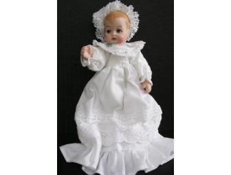 Doll with porcelain head and hands. Hand embroidery on bib. Measures 8” tall.