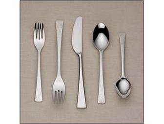 Beautifully crafted and a pleasure to use, Gorham's Biscayne flatware is made of 18/10 stainless steel and features hammered handles for a contemporary look. This comprehensive set includes twelve 5-piece place settings (place fork, place knife, salad fork, place spoon, and teaspoon) and one 5-piece hostess set (sugar spoon, butter-serving knife, cold-meat fork, tablespoon, and pierced tablespoon).