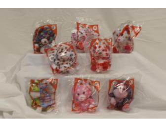 This is the fourth collection of mini-plush Build-A-Bear Workshop furry friends to be featured in McDonald's Happy Meals. They debuted in the winter of 2012 and were available until early March. Build-A-Bear toys first appeared in Happy Meals in 2006. Complete set includes 8 miniature versions of popular Build-A-Bear retail animals; Peace & Sweetheart Bear- blue plush teddy bear wth printed heart and peace sign pattern, Cinnamon Swirl Friendship Bunny-pink and white plush bunny with printed heart pattern, Endless Hugs & Friendship Teddy- white plush teddy bear with printed heart pattern, Shaggy Sweetheart Pup- black and white plush puppy with printed heart pattern and red heart around the eye, Friendship Dimples Teddy- red and white plush teddy bear with printed heart pattern, Friendly Sweetheart Frog- green plush frog with printed heart and flower pattern, Friendship Read Teddy-pink plush teddy bear with printed heart pattern, Marble Sweetheart Monkey- purple plush monkey with printed heart pattern.