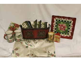 The elegant tea service set in a metal poinsettia planter contains the following items: 2 mugs, 1 serving plate, 4 napkins, 2 placemats, poinsettia candle, Bentley's Holiday Spice Tea, red poinsettia scented soy candle 4.5 oz and paper guest towels. All items are poinsettia themed.