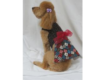 Hand-sewn doggy dress velcros around chest of dog and neck of dog. Will fit dog with chest diameter of 13" or smaller and neck diameter of 3" or smaller.