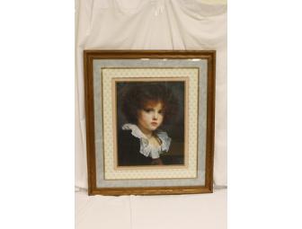 These framed pieces measure 29 inches wide x 33 inches long. If hung on a wall, they would come out 1 inch from the wall. The wooden frames hold a Victorian style image of a (1) a young woman and (2) a little girl. Both of them are seen from the shoulders up and look as though they are calmly thinking. The portraits are surrounded by 3 mats. The outermost mat is a pale blue color. The second mat is a textured fabric mat that has a faint floral design on it. The innermost mat is thinner, and is pale pink in color.