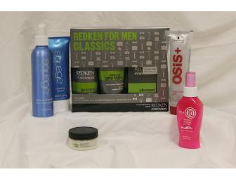 Package includes: Redken for Men go clean shampoo 10 oz., Redken for Men grip tight holding gel 5 oz., Redken for Men cleanse bar 5.3 oz., It's a 10 miracle leave-in product 4 oz., Osis+ 2-phase curl cream 4.25 oz., Aquage detailing creme 4 oz., aquage thermal spray 7 oz., and Hempz body butter 1.5 oz.