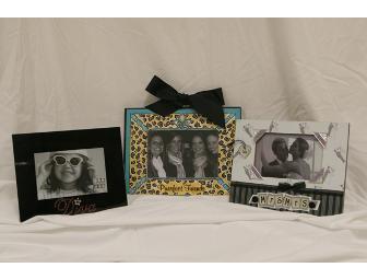 This set includes: black frame with "Diva" embellished in pink rhinestones fits a horizontal 4 inch x 6 inch photo, scrap book inspired Mr. & Mrs. frame also fits a horizontal 4 inch x 6 inch photo, and teal and cheetah "Purrfect Friends" frame can sit on table or hung on the wall with pretty black ribbon bow fits a horizontal 4 inch x 6 inch photo.