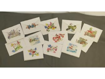 Perfect for sending a "tiny note" to someone special, these 12 notecards feature Judy Blasdell's assorted watercolor designs. Cards measure 3.5 inches x 5 inches. The fronts of cards as well as the back on the envelopes are printed with a watercolor design. http://www.facebook.com/judyblasdell.patchworks#!/judyblasdell.patchworks/photos