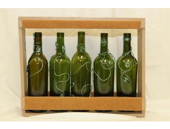 Beautiful green glass wine bottles adorned with metal art in an attractive display case. Bottles do not have toppers. Bottles measure approximately 13" each.