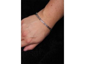 This elegant bangle will go with anything in your wardrobe. The sterling silver features a beautiful design and the channel set cubic zirconia stones really make it unique. Bracelet has an 8 inch circumfrence and clasps on the side. http://www.beechwoodnet.com/z/jewelry.html