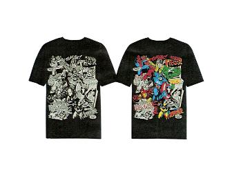 Find the Super Hero in you! This tee showcases the best heroes of Marvel Comics, including: Spider Man, Captain America, Thor, Iron Man The Hulk, and Wolverine. Black tee features a UV reactive screen print design that changes colors indoors and out, so that the print appears to be black and white indoors and magically reveals the colors when you go outside. Tee is an adult size Large and 100% cotton. www.classicblades.com