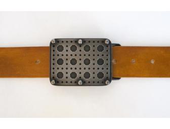 Hand fabricated steel buckle with hand dyed leather belt. Belt can be made to fit winner.