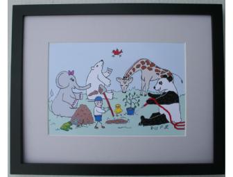 Hand drawn cartoon by Artist Linda McCoy featuring Tai Shan and his friends planting a tree. Framed and matted 11x17.