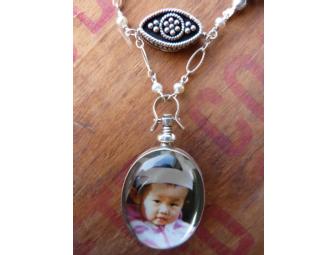Glass pendant may be used to display a favorite photo, quote, word, design, piece of art or anything you desire. Changing the display is done simply by unscrewing the top and opening up the pendant.