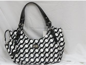 This bag is not only a great accessory but also large enough to carry anything you might need! White part is a faux leather and black design is a soft textured material. The top zips closed and the back features another small zipper pocket. Bag measures approximately 17 inches wide x 21 inches high (including handles). Also includes an additional 44 inch shoulder strap and matching cell phone case. Case measures 3.5 inches wide x 4.5 inches high.