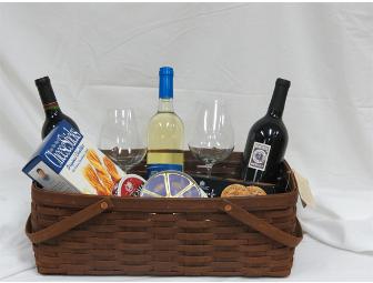 Host a wine and cheese party with this great basket! This Longaberger "long market" basket contains: Sonoma Jacks garlic and herb and pepper jack light cheese wedges, swiss cheese wedges, a box of John Macy cheese sticks, a box of Carr's cheese melt crackers, 2 wine glasses from world market, a bottle of Korbel Zinfandel 2009, a bottle of Pennywise Merlot 2008, a bottle of Blue Ocean vinho verde and 25 wine glass nametags. Name tags are paper and slide around the base of the glass. Longaberger basket measure 17 inches long x 7 inches wide x 7 inches deep and includes a plastic liner.
