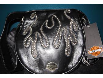 A black leather, studded flame shoulder handbag from Harley-Davidson Motor Company. Genuine leather with silver studs. Harley-Davidson logo on front.