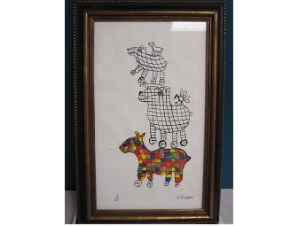 A framed painting by Wisconsin artist, Dennis Pearson, "Piggy Back" (1971) is a playful and bright silkscreen print with watercolor. Print 8 of 28, this piece is over 40 years old and features a black and gold antique frame.
