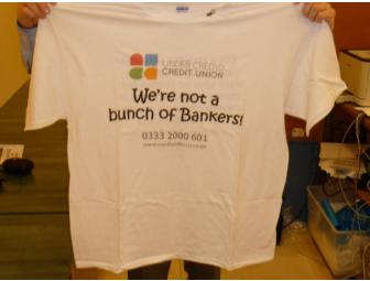 Featuring a current promotion at North Wales CU, this t-shirt is printed with the credit union logo and the slogan "We're not a bunch of bankers." Included with the item is a souvenir pin.
