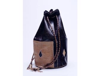 Handmade leather handbag in Tuareg style made in Niger, West Africa. Pouch style, featuring braided leather drawstring handles and outside pockets. Hand stitched in beautiful tan and brown leather. One of a kind! 14" high and 6" around.