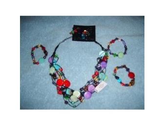 This beautiful set is so colorful that it will literally match everything in your wardrobe! It's great for any season and will brighten your outfit and mood! Necklace is hematite plated with genuine tiger's eye shells and sotne and glass beads. Necklace is made of 7 strands and is 20 inches long. Bracelets are a set of three. Bracelets stretch up to about 7 inches. Earrings are made of the same stones and beads as the necklace and bracelet. Earrings have are fishhook for pierced ears and dangle approximately 1.5 inches.