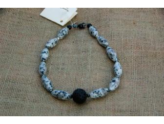 Stunning necklace of jasper, hematite, and lava with a sterling clasp. Handmade by noted jewelry maker Dodie Stewart, whose designs use natural gemstones and materials. Dodie fashions one-of-a-kind pieces for shows or on commission.