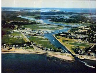 Photograph featuring an aerial view of the Annisquam River and beyond to Ipswich Bay. Includes Western Avenue, Essex Avenue, Gloucester High School, and more.