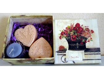 2 heart shaped "Somali Rose" decorative soaps ( 2" x 2") and a lavender colored scented candle, all in a lovely gift box.
