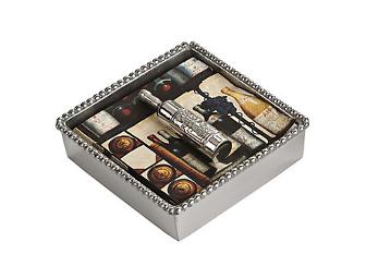 Celebrate your love of a fine vintage with our classic napkin box from Mariposa. Each selection features a beaded border, a wine bottle weight, and a set of cocktail napkins (pattern of napkins will vary). For the hostess, the home, or just because, Mariposa's napkin boxes are the perfect gift for any occasion.