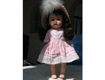 Muffie wears a vintage outfit hand made especially for her, with pink gingham check dress with eyelet, rickrack and embroidered accents, matching panties, and a pink straw hat with plume. Her original plastic shoes were lost, but she now wears new little pink maryjane shoes (not shown).