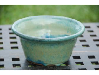 This hand made pottery bowl features soft green and blue colors.  It measures 7.5” in diameter, and stands 3.5” tall.