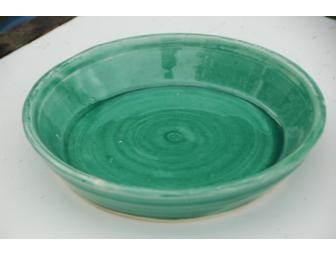 This hand made pottery dish contains soft grass green colors, and measures 9.75” in diameter, and stands 2” tall. Imagine it filled with luscious fresh strawberries!