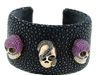 Black diamonds, white diamonds and precious pink sapphires adorn this breathtakingly unique and eye-catching creation with an appraised value of $12,000. Total carat weights of the stones, set in 18k gold, are .23 cttw of white diamonds, 1.41cttw of black diamonds and approximately 5.5cttw of pink sapphires on a cuff made of black shagreen. The bracelet is 1.5" tall and will fit a wrist from 5" to 8" in diameter.