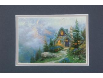 This double-matted print measures 8” x 10” (the image size is 4” x 6”). It shows a charming cottage set amongst pines, with the light from the windows spilling out to welcome visitors. Classic Thomas Kinkade print.