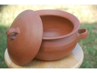 This beautiful 9.5” handled handcrafted earthenware pot with lid is safe in the oven and microwave. It measures ~8” tall to the top of the loop in the lid.