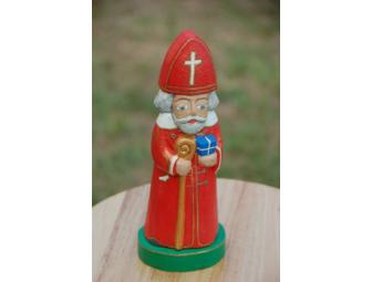 This hand carved and hand painted Santa is from Poland, by artist Jerzy Zbrozek. It stands ~ 9.75” tall. With his crosier, Christmas gift and Christmas tree he is very appealing!