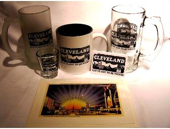 2 tankard mugs (1 frosted, one clear), 1 coffee mug, 1 shot glass, 1 magnet and a vintage style greeting card, depicting a Cleveland landmark (but not with the phrase).