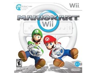 Your favorite go-kart racing circuit is finally coming to the Wii. Just snap your Wii remote into the included steering wheel, and you're ready to enjoy classic Mario racing circuits, as well as plenty of new ones, with your old friends Mario, Luigi, Princess Peach, Wario, Yoshi, Donkey Kong, Toad, Bowser and more. Pick up coins and Koopa shells along the way to increase your speed or blow your opponents off of the track.