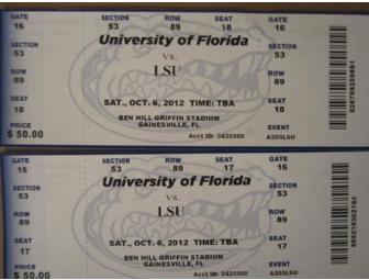 Go Gators! Go Tigers! Two University of Florida vs Louisiana State University Football seats in endzone, Gate 16, Section 53, Row 89 Seats 17 & 18. October 6, 2012. Time TBA.  $50.00 each-total $100.00, this game is sold out!