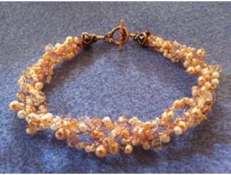 A blend of Swarovski crystals, fresh water pearls, and seed beads on tarnish-resistant copper wire with a toggle clasp. Bracelet can be twisted gently to tighten/loosen strands before clasping for length adjustment.