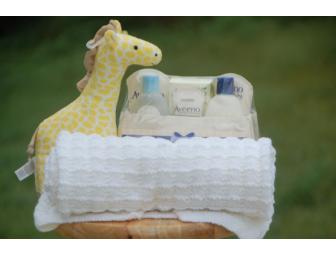 Just for baby, a super soft hand knit blanket in cloud white nestled next to a plush musical giraffe set the scene for sweet dreams. A basket of Aveeno baby producs pamper baby's delicate skin.
