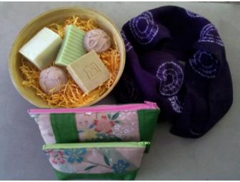 This gift basket includes a handkerchief, linen weight scarf with eighteen circles which were carefully positioned, hand-stitched and bound to create this classic shibori scarf. The scarf measures 68" x 9" and has a rich red-violet background. This handcrafted scarf is one-of-a-kind. The basket also includes three zippered pouches made from Japanese chirimen fabric. Fully lined, the pouches are sized to organize small items like cosmetics, jewelry, mobile phone or passport. Finally, your gift basket includes a selection of handcrafted glycerin & cold process soaps.